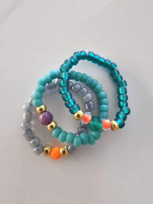 Ringetjes geregen op soepel elastiek met Miyukikraaltjes en Rocailles.