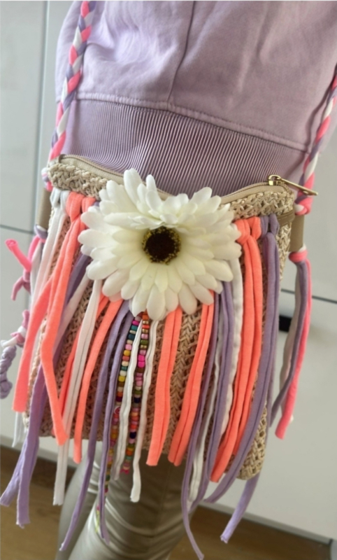 • Het pimpen van een mooi tasje voorzien van rits en binnenvoering. Kralen, je naam, bloemetjes, veren, lint en band. Er is vanalles om het mooiste tasje te maken van jouw keuze. Omdat alles aanwezig is in mijn atelier kunnen we het tasje ontzettend gaaf pimpen.