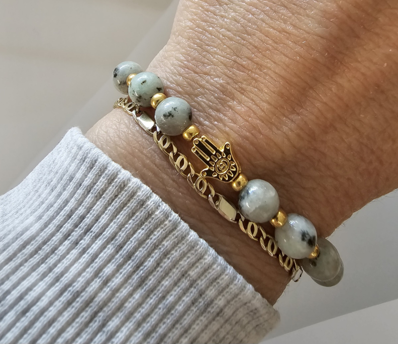 Kiwi Jaspis HappyMala 6mmHappyMala met Kiwi Jaspis 6mm edelsteen en een gold plated Hamsa handjeLaat spanning los en kies voor lichtheid met de kiwi Jaspis HappyMala Kiwi Jaspis helpt je ontspannen en brengt een zachte, positieve flow.