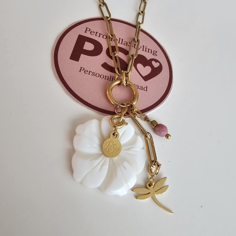 Complete set met aanvulling | modulaire kettingComplete modulaire kettingDe set bestaat uit een• paperclip basis ketting gemiddelde lengte 45 cm• ronde connector (12mm creool)• connectiehanger (lengte 2 schakels)• pendant Bloem van schelp aan mini slotje• little…