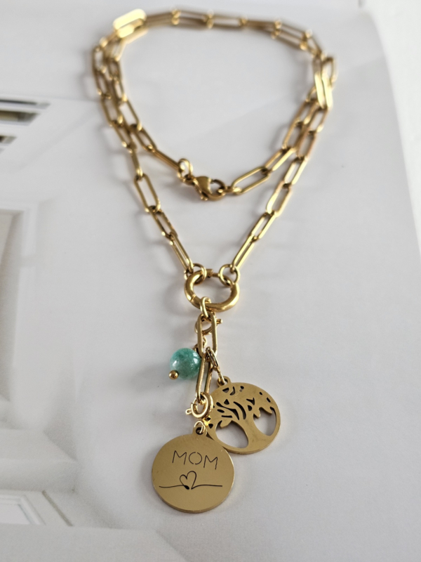 Complete set met aanvulling | modulaire kettingComplete modulaire ketting setDe set bestaat uit een• paperclip basis ketting gemiddelde lengte 45 cm• ronde connector (12mm creool)• connectiehanger (lengte 2 schakels)• pendant Levenboom gold plated Stainless steel aan…
