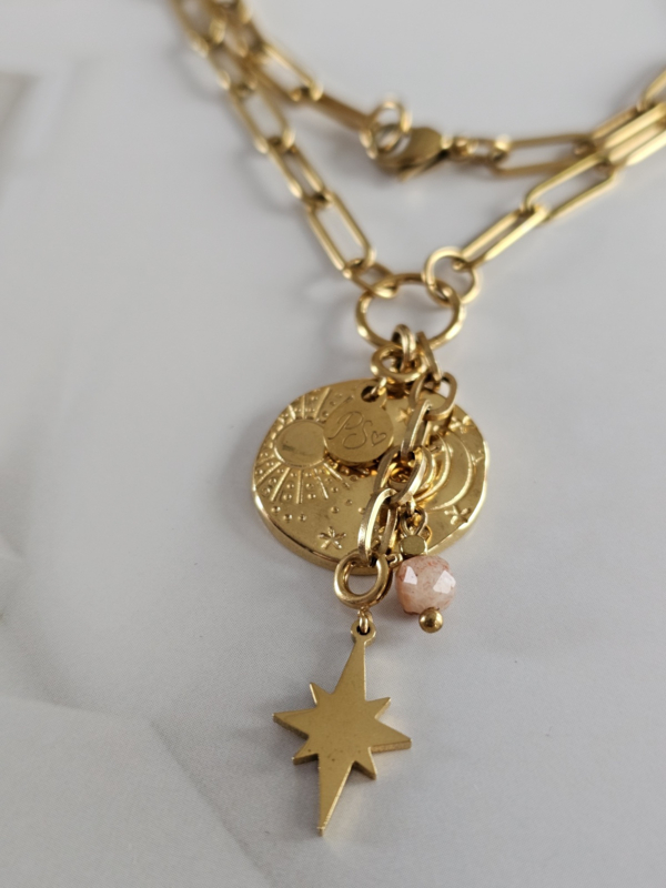 Complete set met aanvulling | modulaire kettingComplete modulaire kettingDe set bestaat uit een• paperclip basis ketting 52 cm• rond slotje• connectiebedel (maat 2 schakels)• pendant munt Moon/Sun gold plated Stainless steel • little Blessing charm Zonnesteen aan…