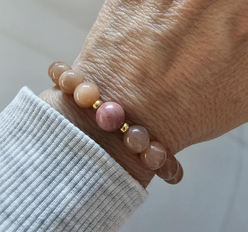 Maansteen & Rhodoniet BlessingMala 8mmPinkMoon BlessingMala armband Abrikoos Maansteen & drie Rhodoniet Blessingkralen. Spiritueel sieraad met Blessing ritueel. Deze armband helpt je om stil te staan bij intenties, dankbaarheid en positieve energie.De blessingkralen…