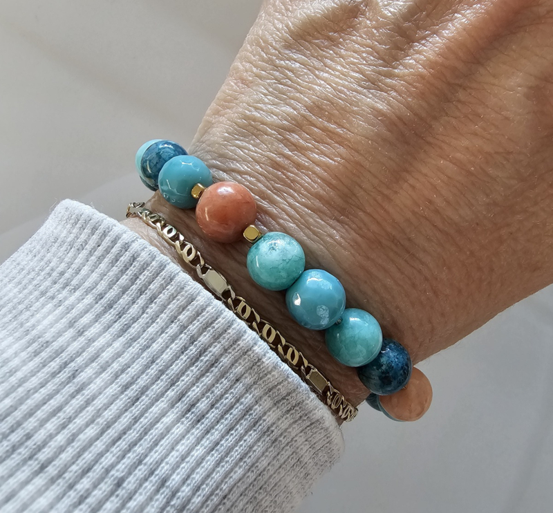 Kiwi Jaspis bevat Amazoniet, zwarte stipjes Toermalijn en kwarts (bergkristal)