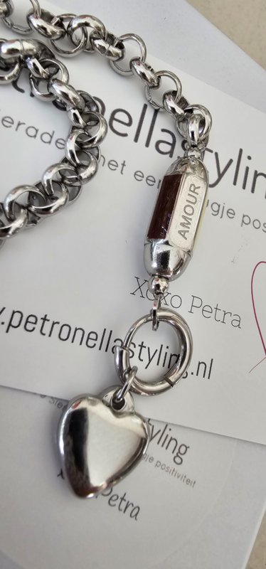 Schakeldeel van stainless steel om aan de 50/50 beads te bevestigen. Deze schakel heeft een vaste Messagebox bedel met de tekst AMOUR Incl zwaar stainless steel hartjes bedel en 12mm connector.Dit is dus 1 helft voor het maken van…