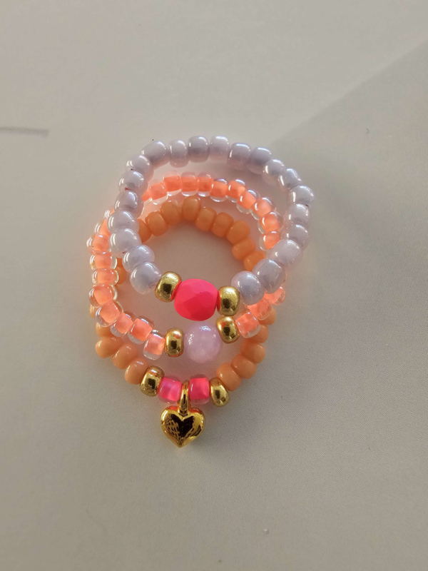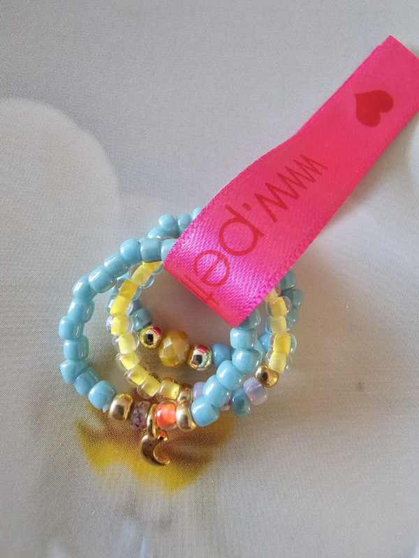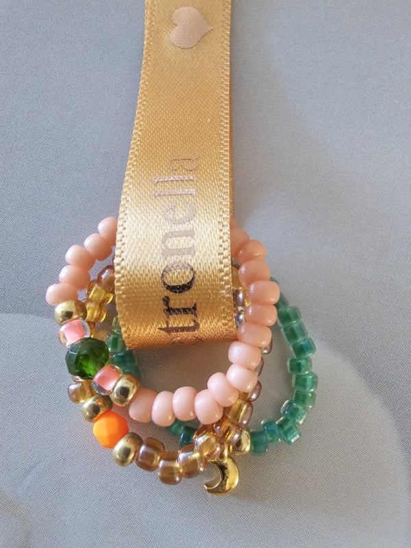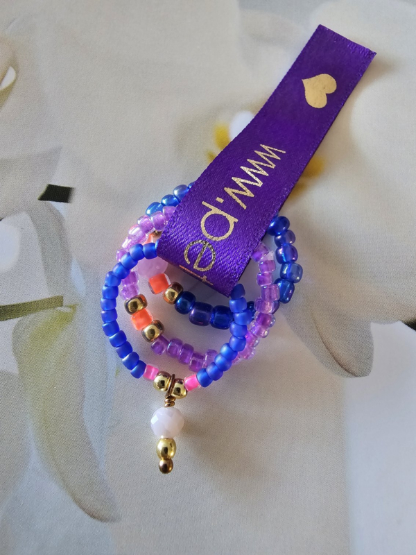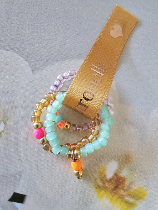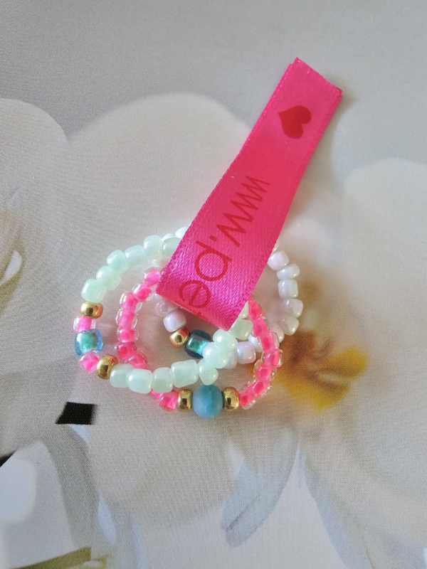 Setje met elastische ringetjesSetje met drie elastische ringetjes Ringetjes geregen op soepel elastiek met Miyukikraaltjes en Rocailles.Lengte gemiddeld 6 cm rekbaar.Setje van drie ringetjes